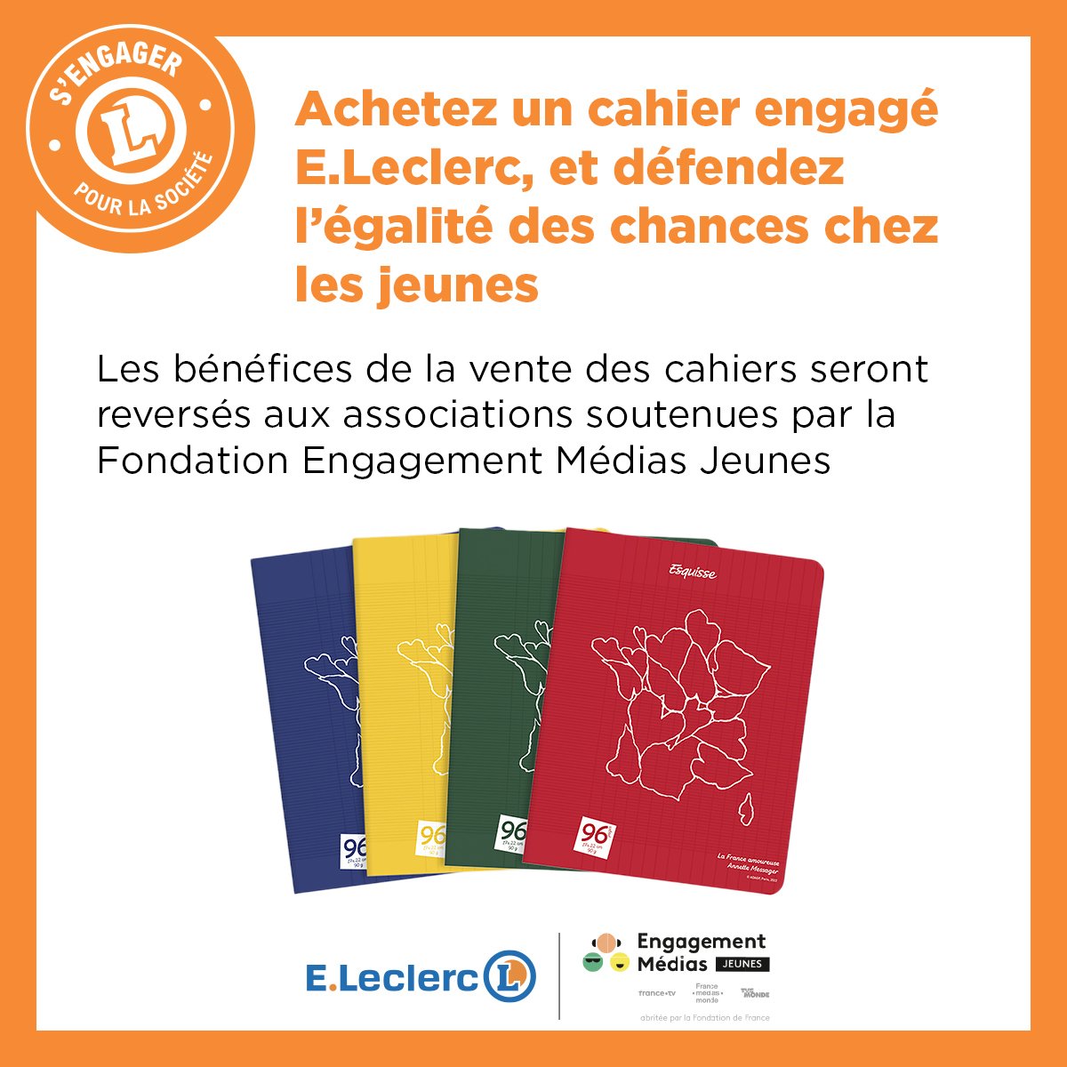 Projet à l’initiative de France Télévisions et de la Fondation, les Cahiers Engagés E. Leclerc sont des cahiers produits et distribués par E. Leclerc et dont les produits des ventes sont intégralement versés au budget redistributif de la Fondation.