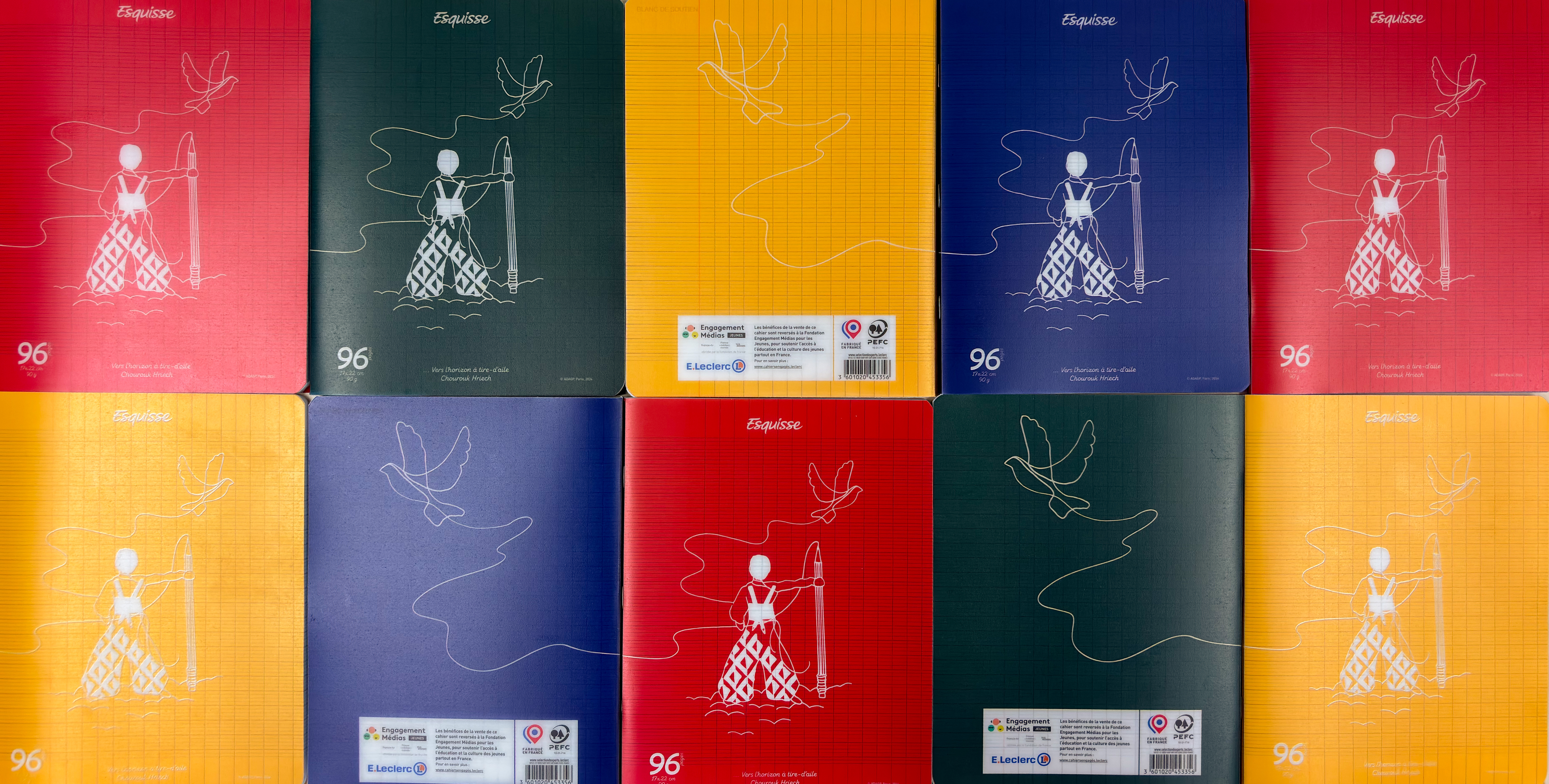 En vente dans tous les centres et magasins E. Leclerc pendant l’été, ces cahiers portent chaque année sur leur couverture une illustration originale d’un ou une artiste contemporaine.